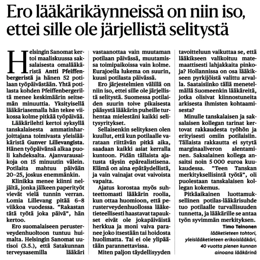En ole millään sortilla asiasta perillä mutta osui silmään jonkun lääkärin kirjoitus lehden mielipidepalstalle. Hän siinä, itse siis lääkärinä, ihmetteli miten Saksassa lääkäri voi ottaa vastaan lähes 50 potilasta päivässä, Tanskassa yli 20, ja Suomessa joillakin sairaaloilla 3-6 potilasta vuorossa. Samaan törmännyt aiemmin kun intiassa kaihileikkauksia tekevä erikoislääkäri käsittelee noin 20 leikkausta vuorossa, kun suomessa samainen erikoislääkäri 2.