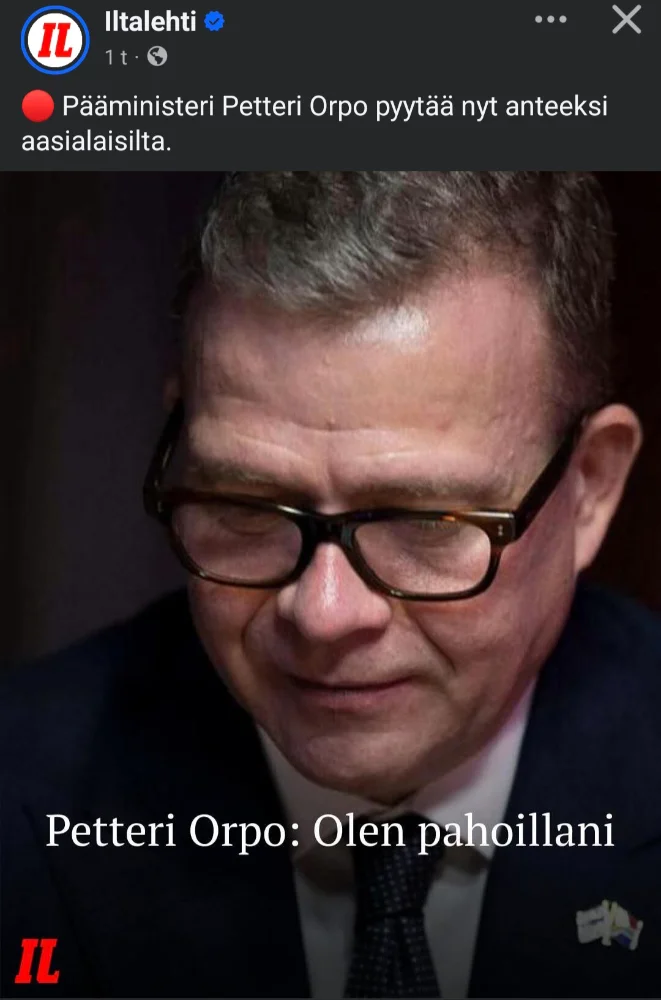 Itseänikin kyllä naurattaa kovasti, että Petteri Orpo pyysi julkisesti anteeksi, ja jäi saman tien saikulle "flunssasta". Vissiin samassa paikassa sen Lasse Lehtosen kanssa "saikulla".