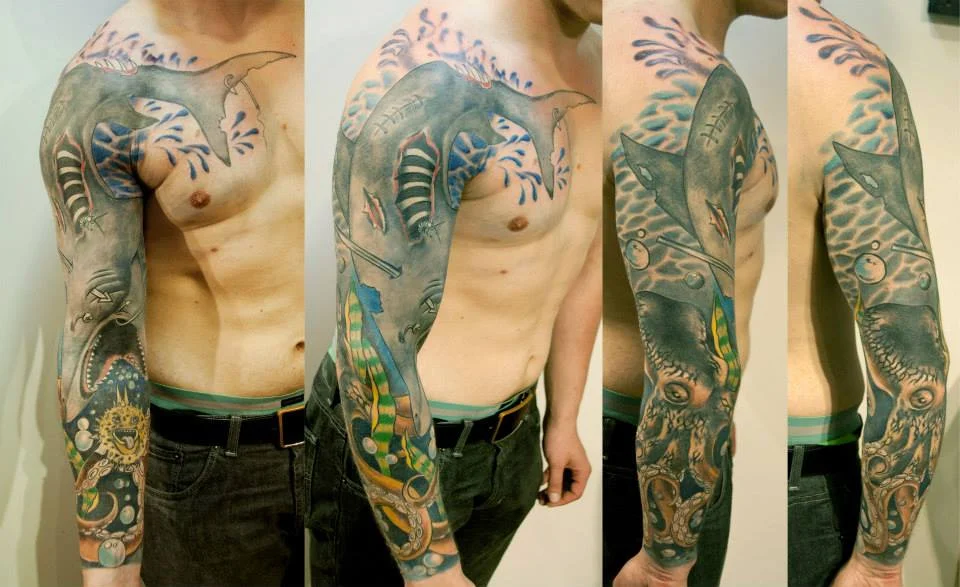 Ehkä tyhmä kysymys, mutta tatuointipaikkoina miettinyt lähinnä blue dragon tattoo tai ducks tattoo. Onkos näissä liikkeissä tarpeeksi ammattitaitoa tehdä alla olevan tyylinen värillinen koko käden tatuointi? Ekaa mahdollista tatuointia pohdiskelen pitkään ja hartaasti.