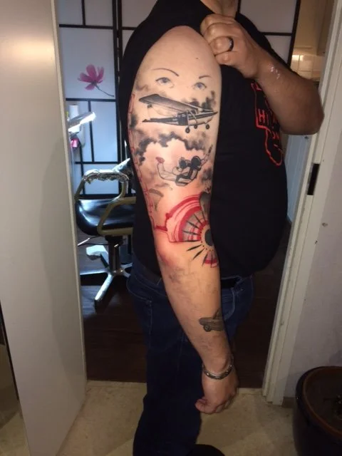 Eilen jatketiin toto toista hihaa 6h verran. Täytynee laittaa kuvaa kun keväällä saadaan valmiiksi. Ranteesta kaulaan asti ja vähän selän puolellekkin niin jokusen session saa taas istua.