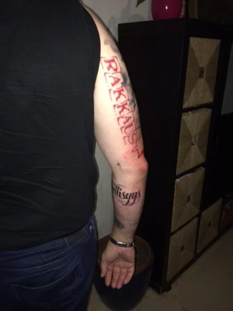 kohta kone alkaa surisemaan ja lisää väriä nahkaan.. 3. päivä "Trash polka"-tyylistä kättä alkaa..