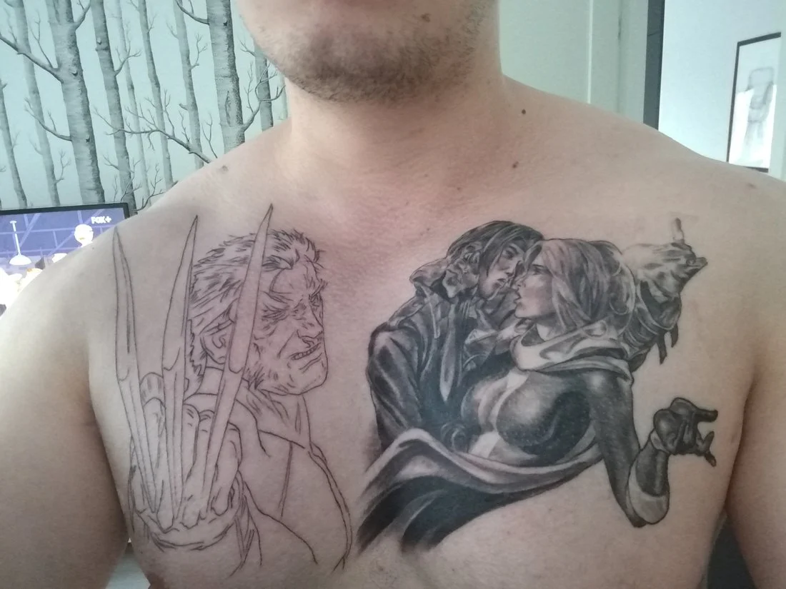 En tiedä onko ideana ihan paska ja miten toteutus mutta vuosia olen miettinyt millaisen leiman haluaisi ja nyt pohtinut jos saisi kylkiluiden kohdalle kämmenen kokoisen läntin joka näyttäisi siltä että olisi nahka revennyt ja kylkiluut näkyisi.