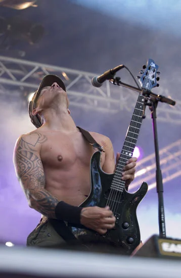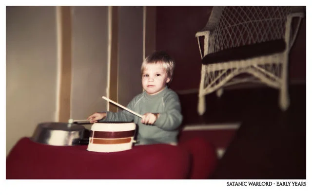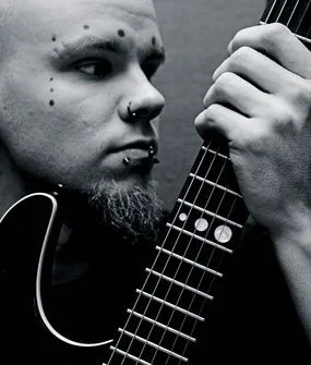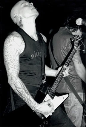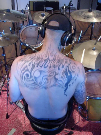-yläselkä. palava sydän jonka sisällä nuottiavain ja olkapäästä toiseen texti "Demon"