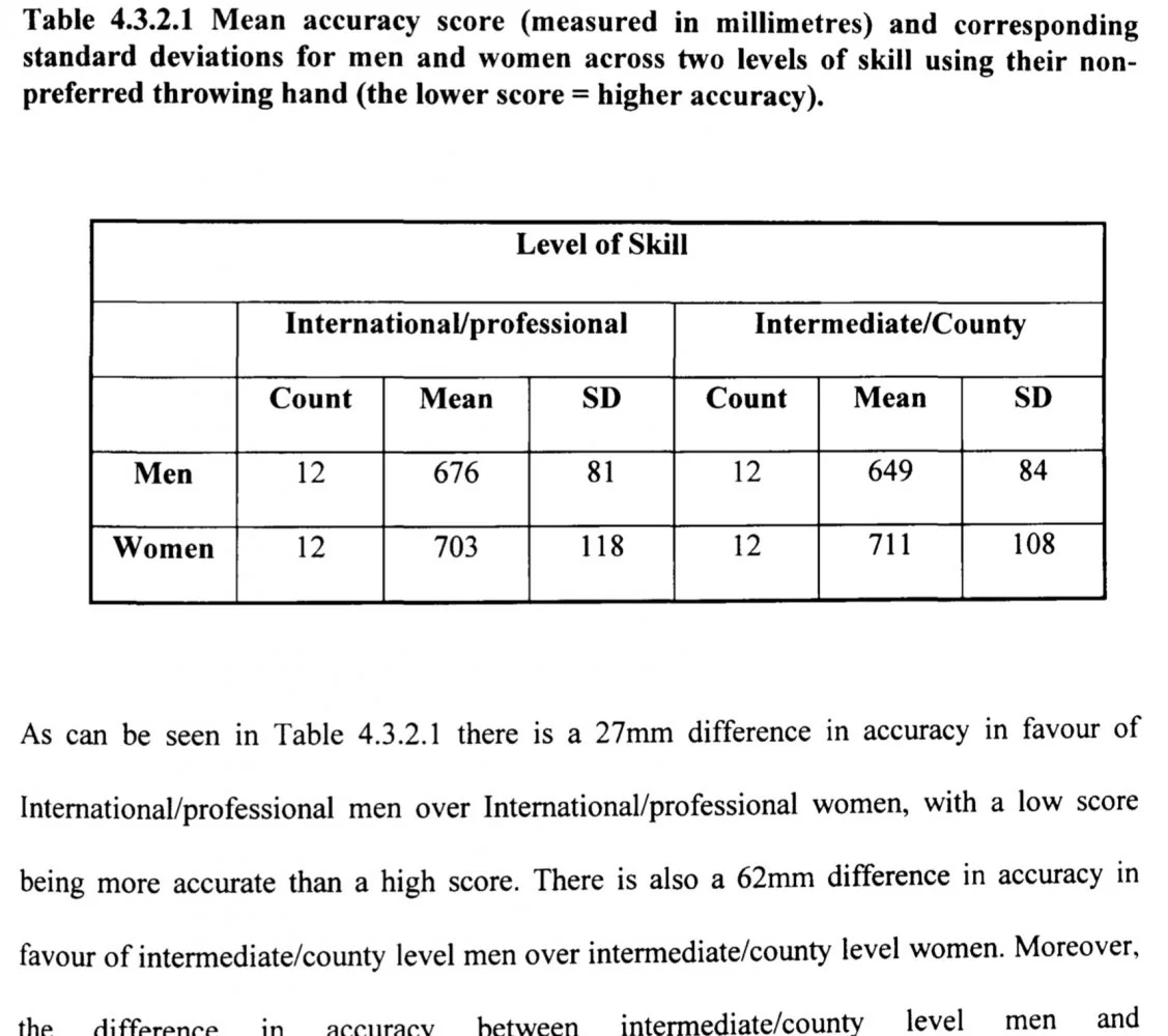 Niin siis 20 osallistujaa heitti 12 tikkaa, tarkkuutta mitattiin millimetreissä joissa pienempi tulos on tarkempi. Tässä laittamassasi taulukossa näkee esimerkiksi että vähemmän kokeneet miehet olivat tarkempia kuin kansainvälisen tason ammattilaispelaajamiehet (luonnollisesti päinvastoin kuin tarkemman käden tuloksissa), mikä ehkä selittää sitä että tutkijoiden mielestä ero ammattilaisnaisten ja -miesten välillä ei ole tilastollisesti merkittävä (27 mm), kun tämän tutkimuksen virhemarginaalissa vähemmän pätevät miehet olivat parempia kuin ammattilaistaso samalla erolla (27 mm). Jos eroa pitäisi merkittävänä, pitäisi tutkimuksen tulos olla paitsi se, että miehet pärjäävät naisia paremmin, myös se että dartsin pelaaminen ammattilastasolla heikentää miesten dartstuloksia. Paremmalla kädellä merkittäväksi tulkittu tulos oli kolminumeroinen. Jännittävä havainto: yksikään testatuista pelaajista ei ollut vasenkätinen.Kaiken järjen ja logiikan mukaan miehet heittää paremmin vasurillakin, niin oli pakko etsiä tuo tutkimus. Ja niinhän se toki olikin. Sivulla 115 on taulukko missä näkyy tulokset ja niistä puhutaan, miehet ovat tarkempia myös heikommalla kädellä. Silti johdannossa ja myöhemmin höpisevät että eroa ei ole miesten ja naisten välillä heikommalla, mikä on omituista.