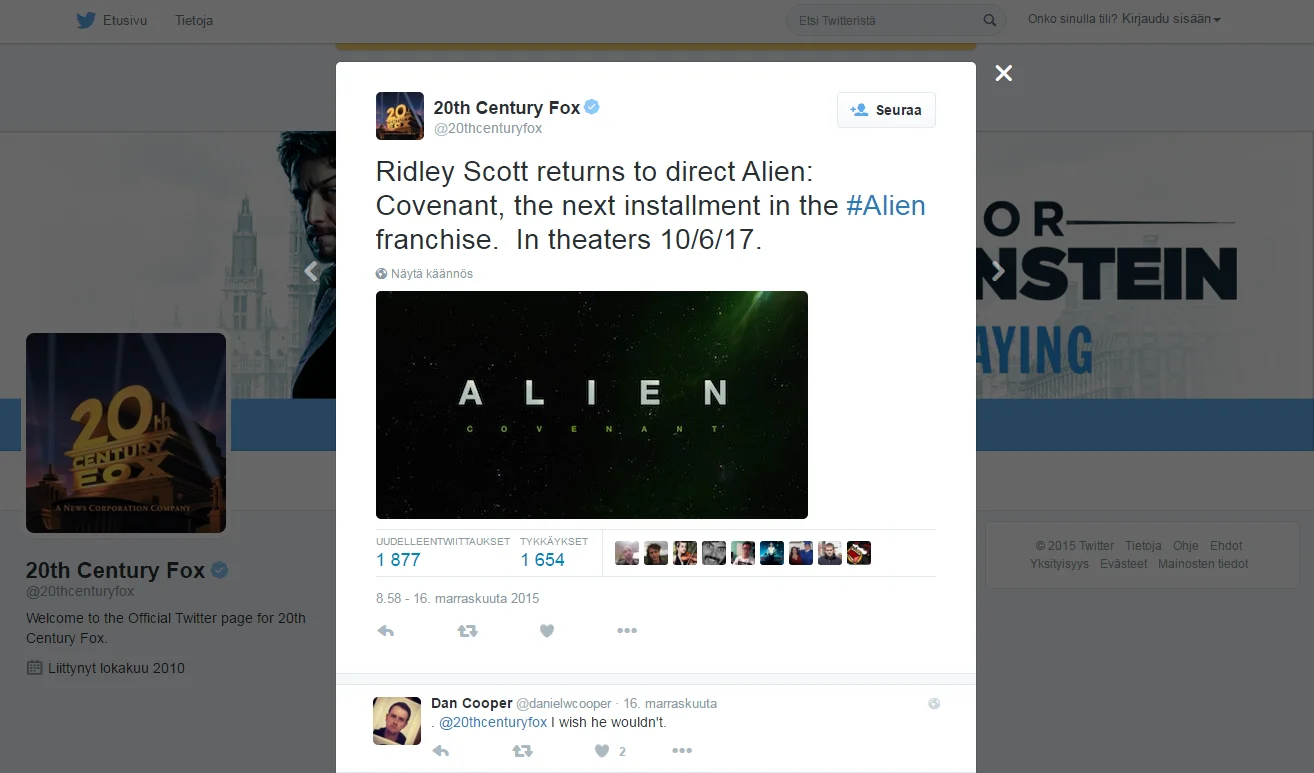 Mitähän tuosta nyt ajattelisi. Pahoin pelkään että alieni pilataan ja pahasti. Ei sen syntyä tarvitsisi selitellä, antaisivat sen vain olla mystinen avaruuden biomekaaninen teurastuskone joka lisääntyy kuin kani ja tappaa kaikki huvikseen. Sen takia se on pelottava, koska kukaan ei oikein tiedä mikä se on ja mikä sen tarkoitus on.