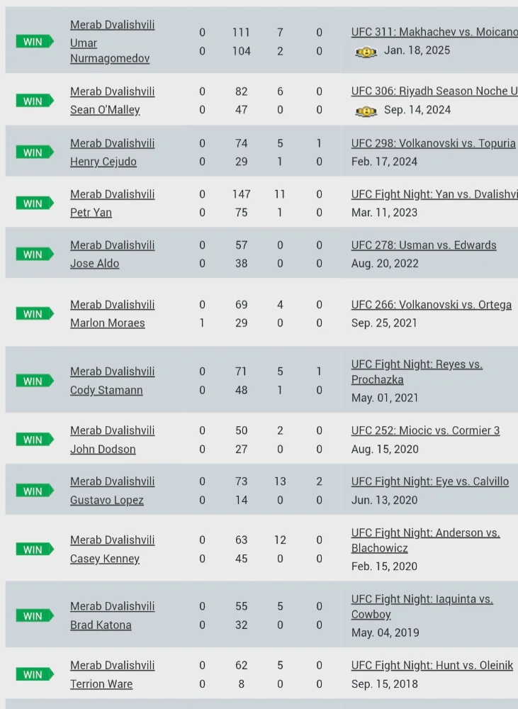 Tuo on muuten aivan totta. Yan, Cejudo, O'Malley ja Umar voitettuina, kun Khabibin parhaat voitot olivat Al Iaqinta, selkeästi alamäkeen jo mennyt Conor, Poirier ja Gaethje.