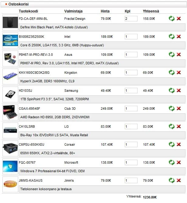 Tuossahan Jimm's kasaa ja testaa, ja ne harvinaiset tapaukset jossa komponentit ei jostain kummasta syystä toimi yhteen tulee ilmi. Itsellä kerran kävi niin että kun kaverille valitsin osat, niin paperilla yhteensopivat osat ei tykännyt toisistaan. Harvinaista, mutta putiikin kasatessa ne huomataan, ja jos myöhemmin ongelmia niin he siitä vastaa. Jimm's on tosiaan vähän huono vaihtoehto nyt, ellei asu lähellä Turkua.