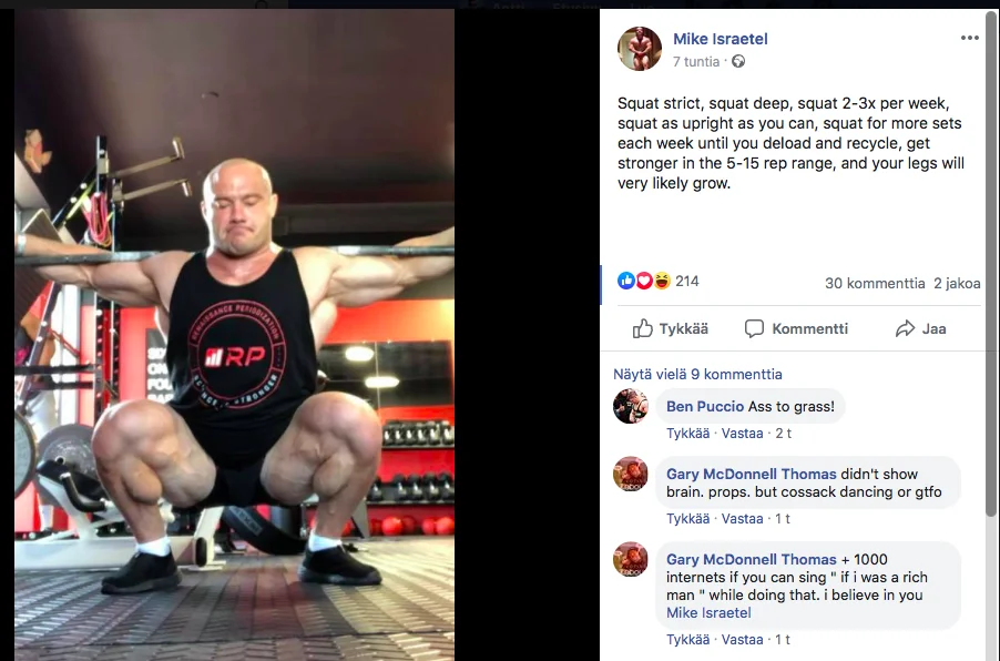 Progressio on myös hyvin yksinkertainen; lisään aina painoja, kun saan kahdessa ensimmäisessä sarjassa tehtyä 5 toistoa. Ja kerran kuussa teen hieman isommilla painoilla 3 x 3 sarjoja. Hauskaa on myös, että ainoa lisäravinne nykyään on keratiinimonohydraatti, kun ennen oli palautusjuomat, beta-alaniinit yms. Mulla vähemmän näyttää olevankin enemmän.