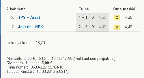 Ässät ei ole hävinnyt turussa 4 vuoteen ja Hpk ei ole voittanut helsingissä 6 vuoteen, mutta eihän se varmaa ole. Ässillä ja Jokereilla kakkosmoket peleillä, joten enpä uskalla iskeä isolla.. tuplana 50e voisi olla hyvä haku.