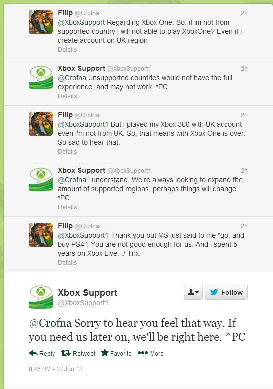 Meikäläisellä on fiilis, että Xboxista on rakennettu puuttuva linkki Microsoft-ekosysteemiin: Windows synkkaa tiedot puhelinten, PC:n ja tablettien välillä, ja koko tästä systeemistä puuttui Windows-digiboxi, jolla voi myös ekstrana pelailla. Eli haluttiin tehdä tommoinen televisioviihdekeskus, jonka ensisijainen tarkoitus ei suinkaan ole pelaaminen, vaan laitteen tarkoitus toimia television ja Windows-synergian tukena. Tämä fiilis vahvistui tästä keskustelusta, kun Xbox Support sanoo suoraan "jos Xbox ei toimi, niin pelaa PC:llä":