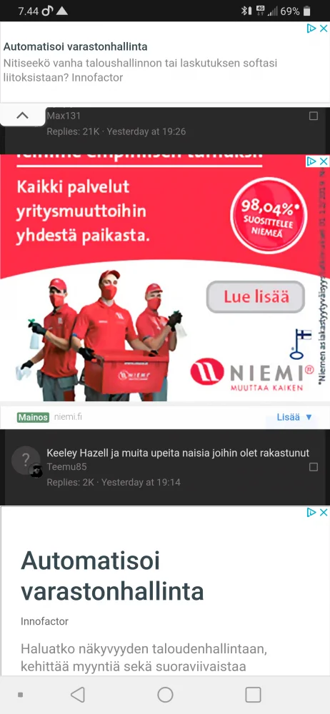 Tulin varta vasten tänne katsomaan onko tästä jo valitettu. Nyt nimittäin on menty jo liian pitkälle. Näytön ylälaidassa on nykyään vitun ärsyttävä kiinni liimattu mainos mikä seuraa koko ajan. Mainokset saattaa mennä niin, että sivun alussa on koko näytöllinen mainoksia ja sivun puolivälissä taas koko näytöllinen mainoksia. Ei tätä voi oikeasti enää käyttää.